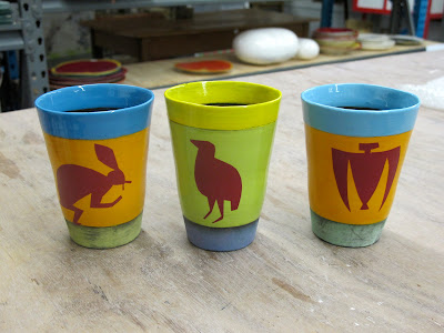 Love your new work, they are striking and the choice of colours are fabulous. Just incredible. They are strong formally and compliment each other very well. I particularly like the images painted in the terracotta colour against the orange chartreuse background, and with the turquoise and or light blue broad band stretching over the rims. Great work and exciting new direction – hopefully they sell well and find homes fast – they deserve to be coveted. Prefer it to the rather harsh black images