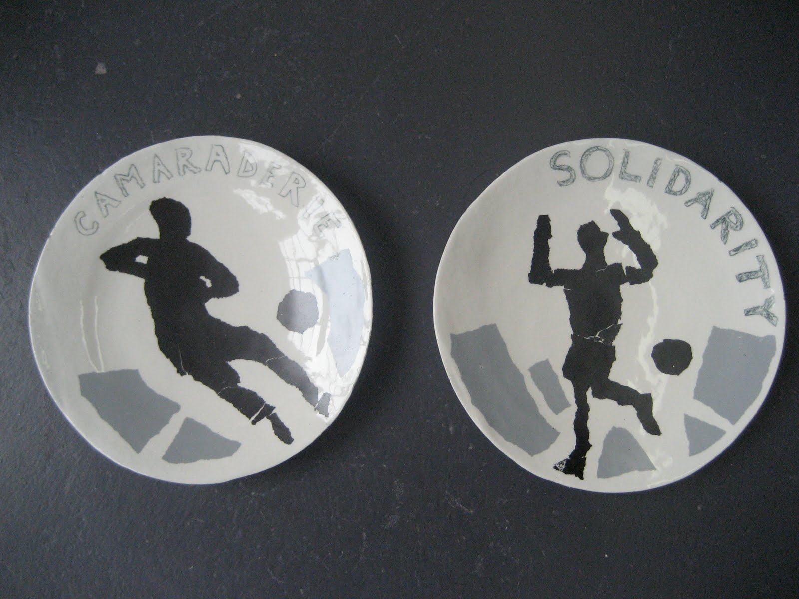 The general hype around the forthcoming soccer world cup must surely be rubbing off on me…inspired by what I made last week for the Isonke exhibition, I have now done a range of plates depicting soccer players in action..I find it quite exciting entering this world which is completely alien to me..