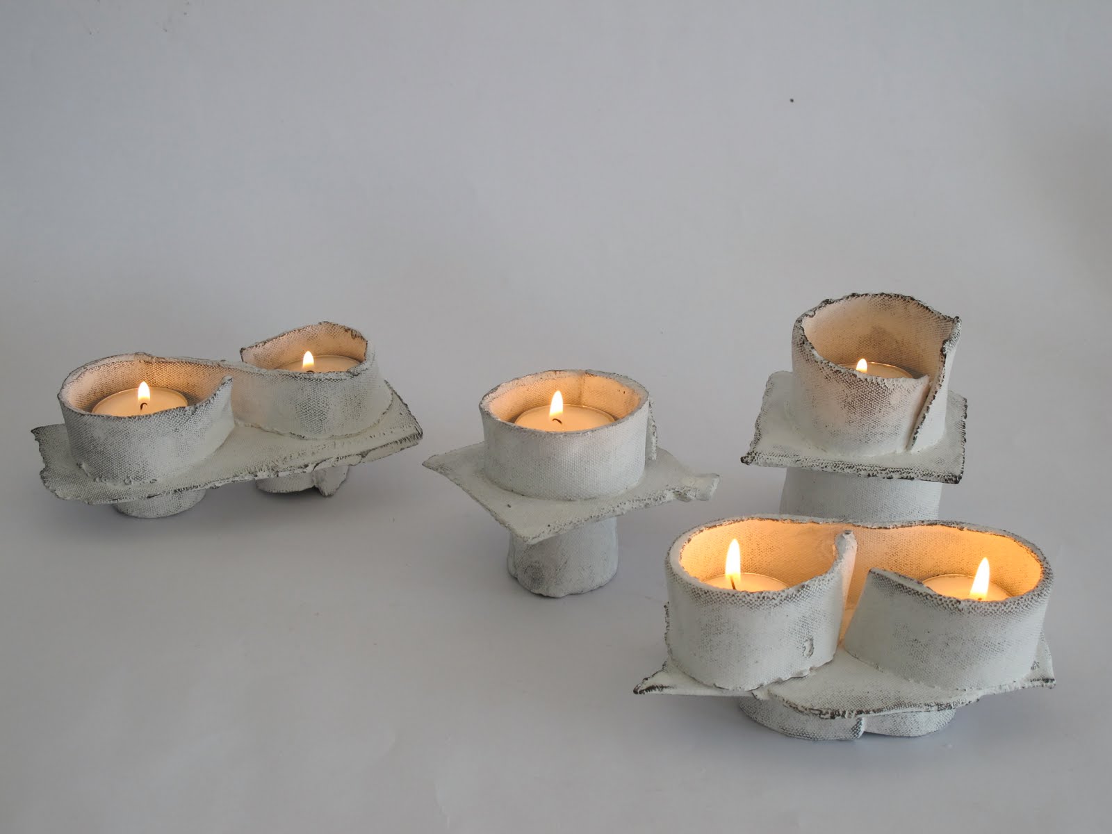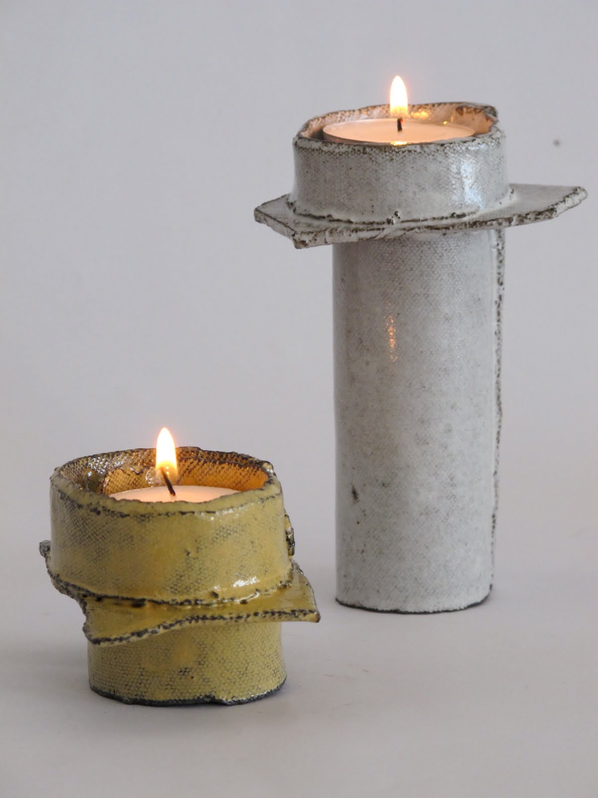 Funky handbuilt candleholders with monochrome underglaze white wash(charcoal earthenware)