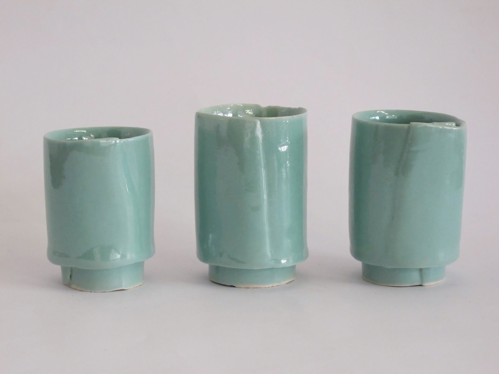In the interests of economy, we are making some new items in the studio which do not require intense surface decoration…so this means letting go of my ‘horror vacui‘(fear of empty space) and settling for a quieter monochrome statement…challenging… The exciting part is focusing on the clay qualities and the marks of the construction process, this makes for a very direct and fresh visual effect.