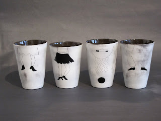 And so I have been having a lot of fun, – inspired by my illustrations on the wedding cups (see previous post) – surfaces of beakers where I imagine and draw simple line characters offset by solid black areas. I use a wonderful waxy matte glaze which gives the cups a very sensual tactile quality.