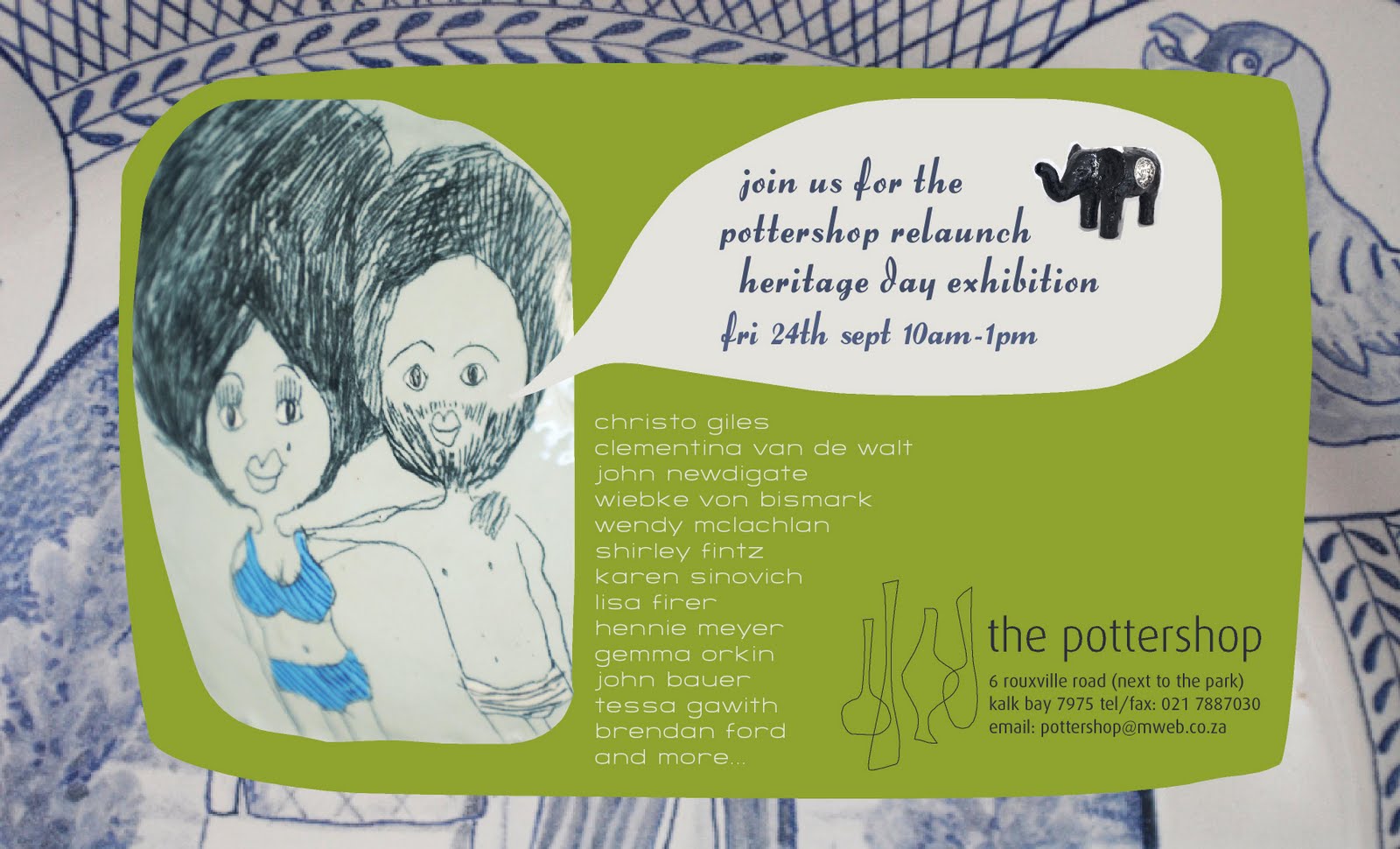 This certainly is a crazy week…tomorrow there is a Heritage Day exhibition at The Pottershop in Kalk Bay – a re-launch by the new owner Charley – from 10am – 1pm. Then…in Paarl where there is the Cultivaria Festival the whole weekend, we will be doing a studio demonstration at De Poort Heritage Village (Main Road, Paarl)…and it is Spring Festival at The Old Biscuit Mill today, and the Heritage Exhibition at Gallery 88 in Paarl this evening…Whew!! Life is full and exciting…